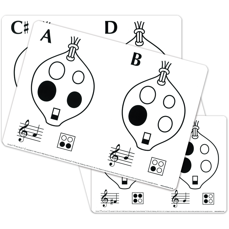A5 / 32 colour pages / 20 tunes with ocarina fingercharts, musical stave, words to songs, guitar chords and CD