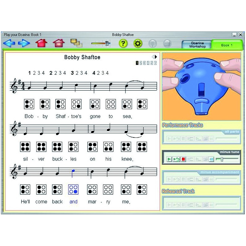 You can also choose the style and speed of the accompaniment to match the skills of the children in your class from super-slow to full performance. The finger-charts and notes light up as the music plays, so that ocarina players at all stages of learning can follow and join in successfully.