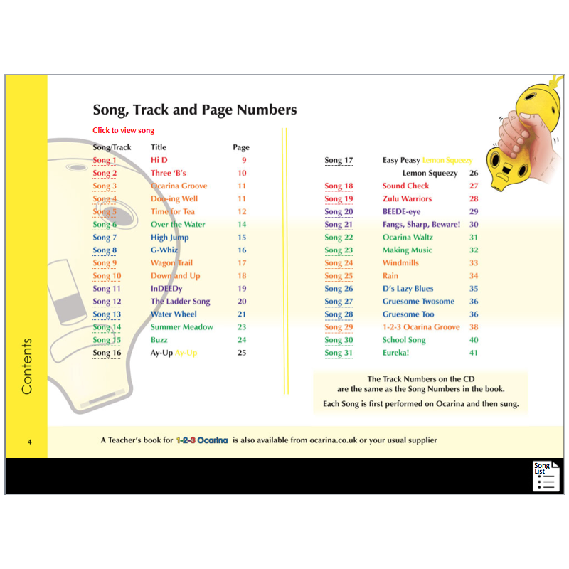 '1-2-3 Ocarina' introduces the first 10 ocarina notes one-at-a-time with easy finger movements to change the notes. All 31 songs have memorable words and are fun for teaching rhythms robustly. It also teaches great musicianship – count in together, remind yourselves of the notes needed and play together, reading directly from the staff notation.
